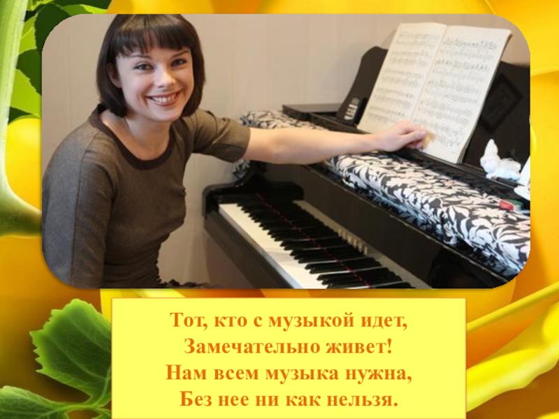 Тот, кто с музыкой идет, Замечательно живет! Нам всем музыка нужна, Без нее ни как нельзя.