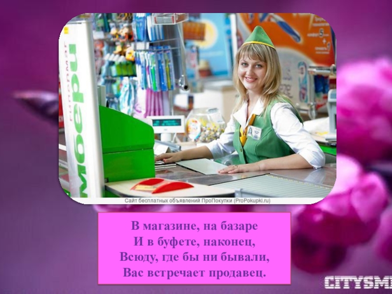 В магазине, на базаре И в буфете, наконец, Всюду, где бы ни бывали, Вас встречает продавец.