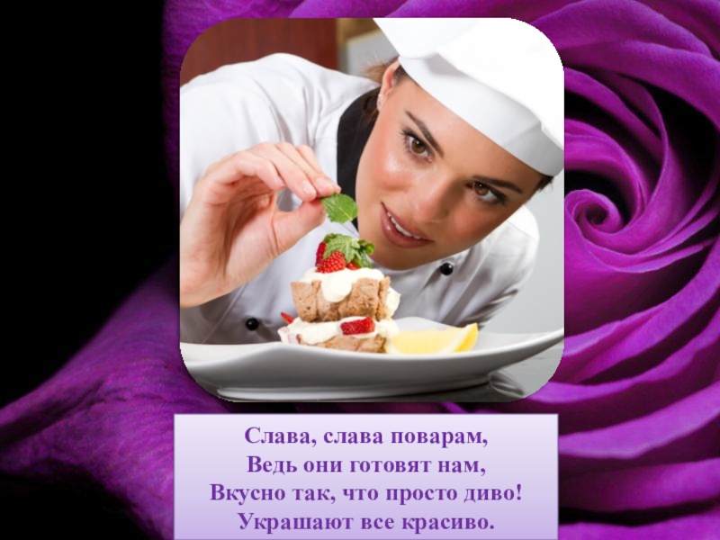 Слава, слава поварам,  Ведь они готовят нам,  Вкусно так, что просто диво!  Украшают все красиво.