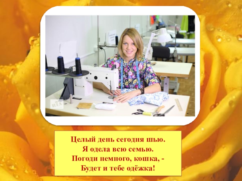 Слайд 4Целый день сегодня шью. Я одела всю семью. Погоди немного, кошка, - Будет