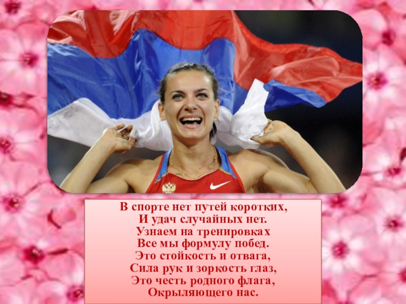 Слайд 20В спорте нет путей коротких, И удач случайных нет. Узнаем на тренировках Все мы