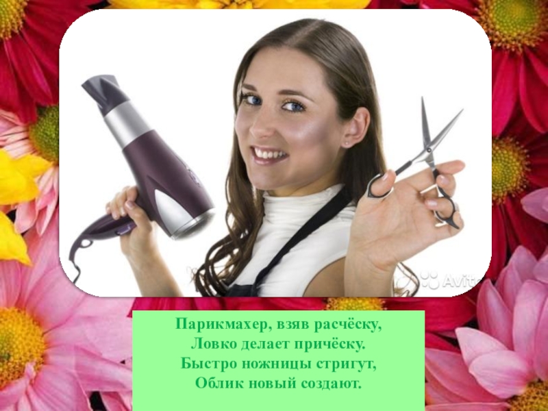 Слайд 19Парикмахер, взяв расчёску, Ловко делает причёску. Быстро ножницы стригут, Облик новый создают.