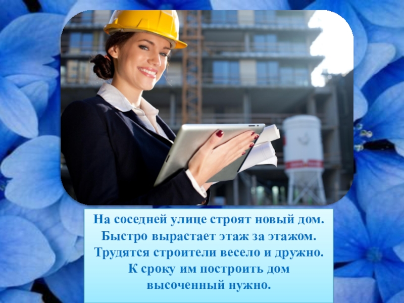 Слайд 17На соседней улице строят новый дом. Быстро вырастает этаж за этажом. Трудятся строители