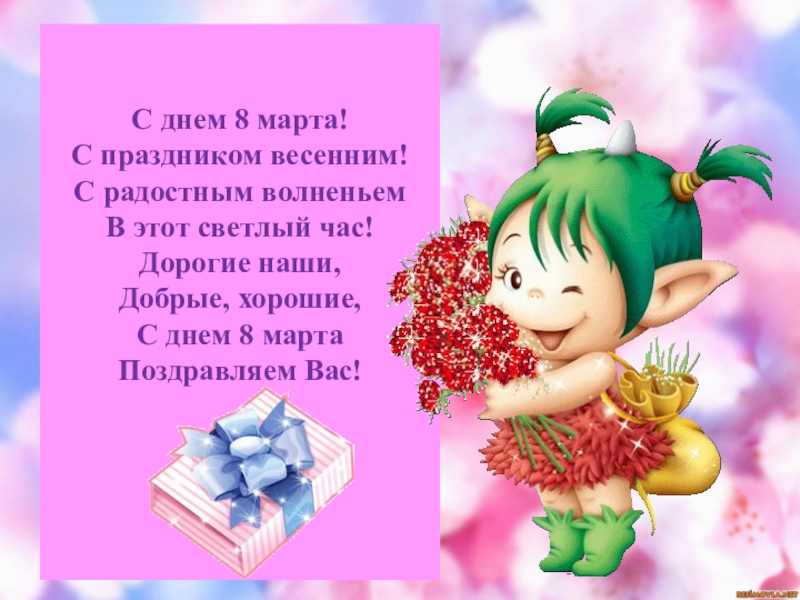 С днем 8 марта! С праздником весенним! С радостным волненьем В этот светлый час! Дорогие наши, Добрые,