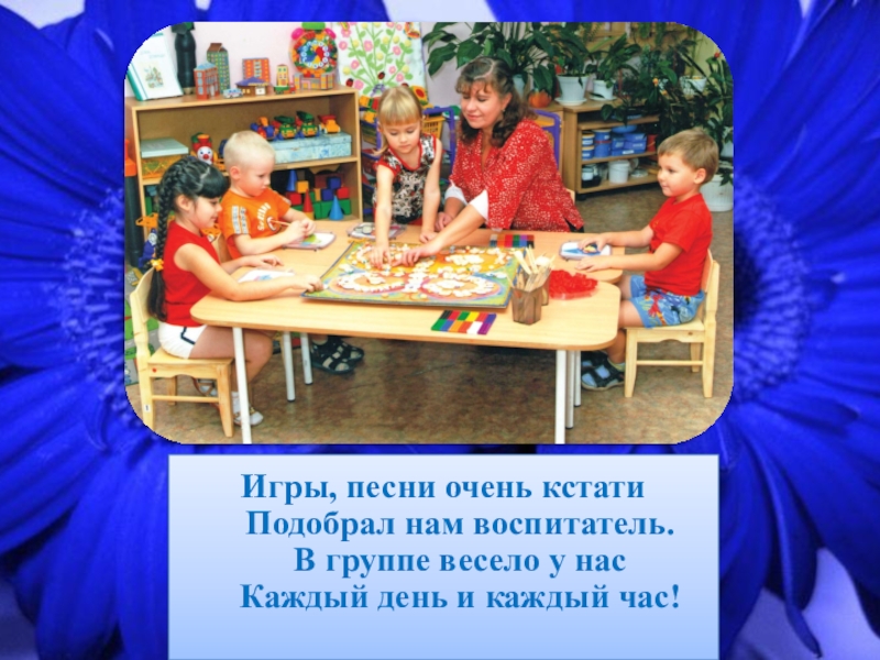 Слайд 15Игры, песни очень кстати Подобрал нам воспитатель. В группе весело у нас Каждый день