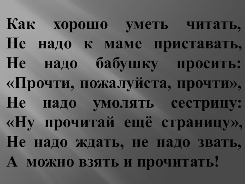 Как хорошо уметь читать,  Не надо к маме приставать, Не надо бабушку просить: «Прочти, пожалуйста, прочти»,