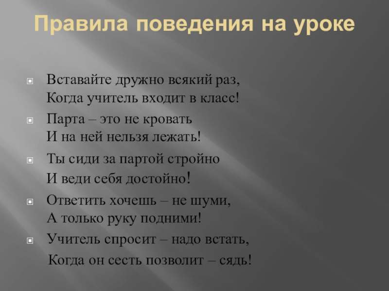 Правила поведения на урокеВставайте дружно всякий раз,  Когда учитель входит в класс! Парта – это не