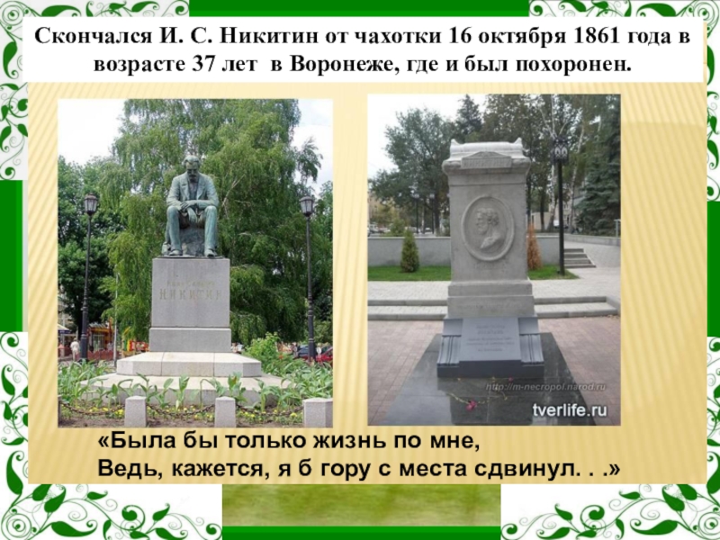 Скончался И. С. Никитин от чахотки 16 октября 1861 года в возрасте 37 лет в Воронеже, где и был похоронен.