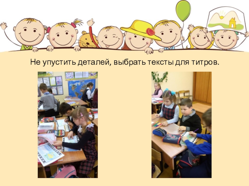 Слайд 7Не упустить деталей, выбрать тексты для титров.