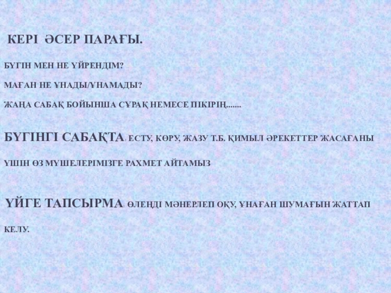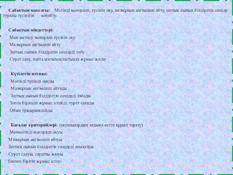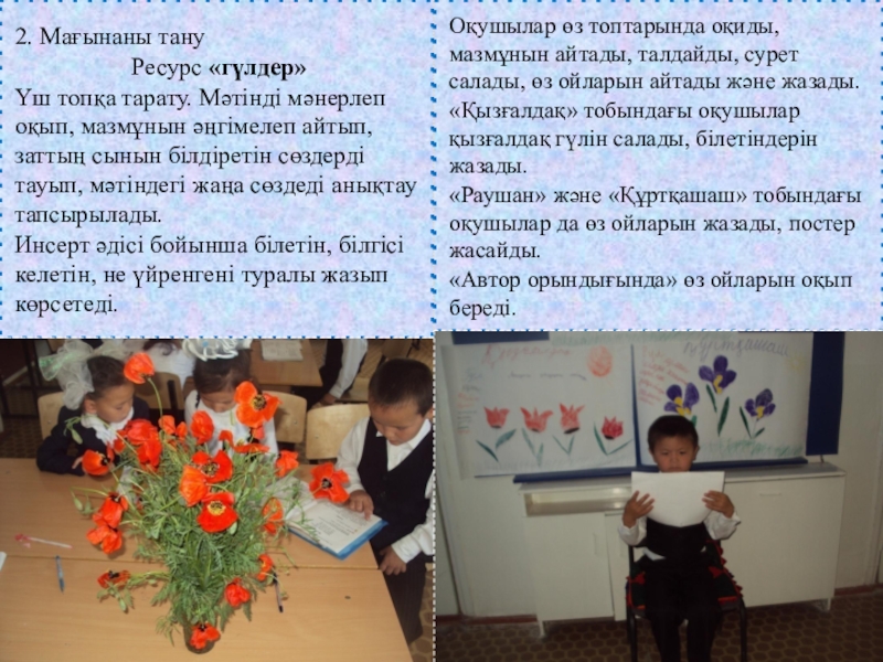 Оқушылар өз топтарында оқиды, мазмұнын айтады, талдайды, сурет салады, өз ойларын айтады және жазады.