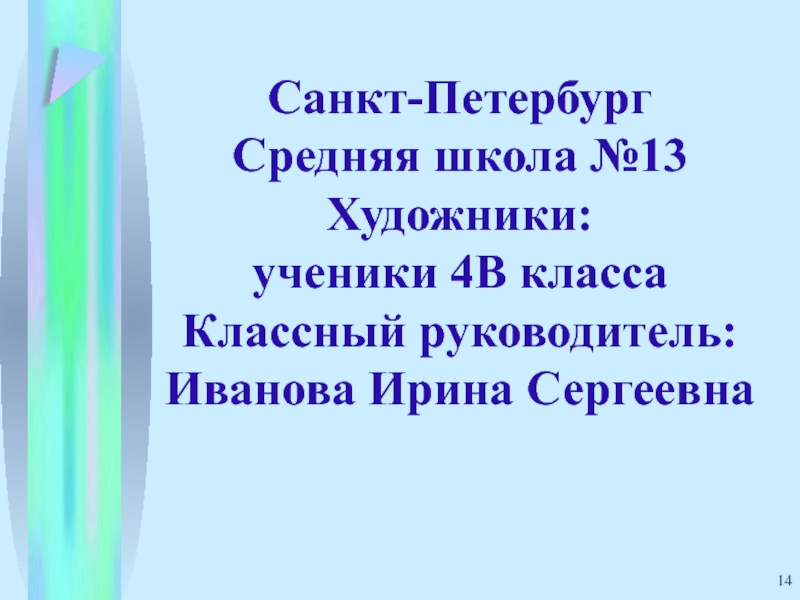 Слайд 14Санкт-Петербург Средняя школа №13 Художники: ученики 4В класса Классный руководитель: Иванова Ирина Сергеевна