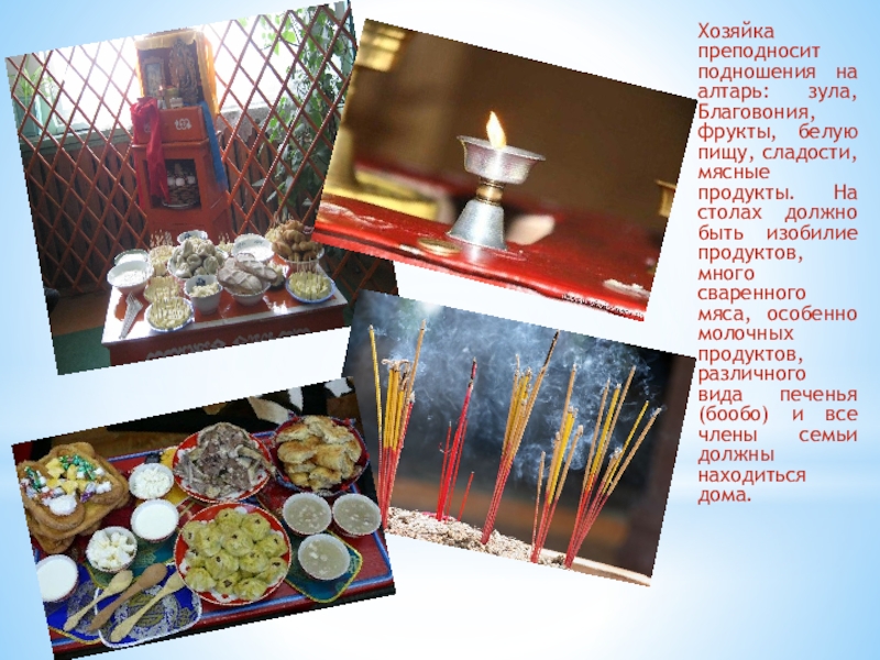 Слайд 7Хозяйка преподносит подношения на алтарь: зула, Благовония, фрукты, белую пищу, сладости,