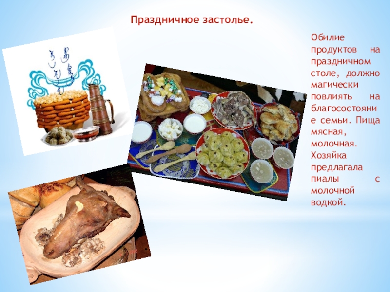 мясные продукты. На столах должно быть изобилие продуктов, много сваренного мяса, особенно молочных продуктов, различного вида печенья (бообо) и все члены семьи должны находиться дома.