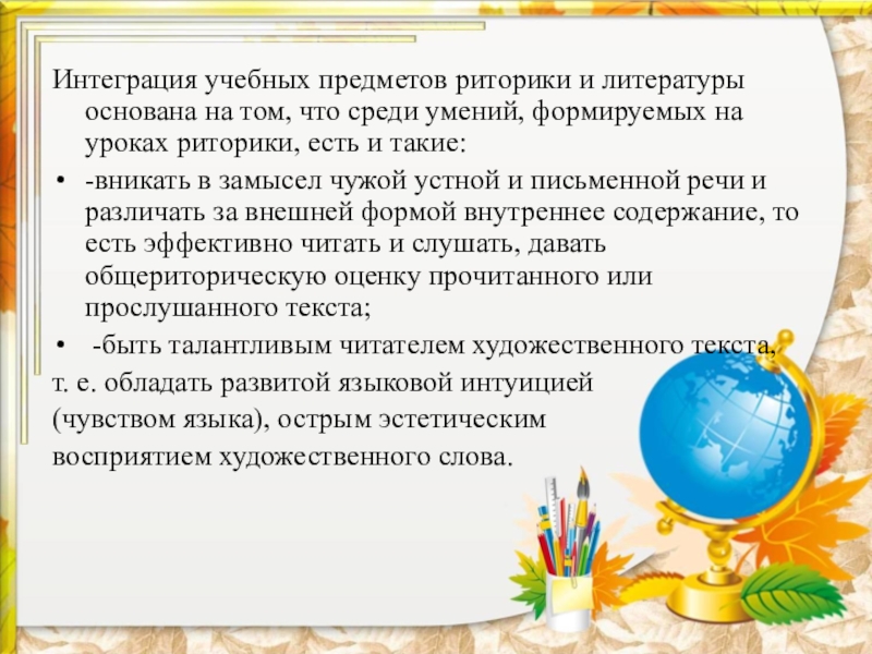 Интеграция учебных предметов риторики и литературы основана на том, что среди умений, формируемых на уроках риторики, есть
