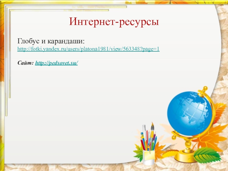 Интернет-ресурсыГлобус и карандаши: http://fotki.yandex.ru/users/platona1981/view/563348?page=1 Сайт: http://pedsovet.su/