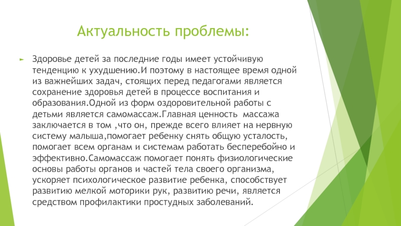 поэтому в настоящее время одной из важнейших задач, стоящих перед педагогами является сохранение здоровья детей в процессе воспитания и образования.Одной из форм оздоровительной работы с детьми является самомассаж.Главная ценность массажа заключается в том ,что он, прежде всего влияет на нервную систему малыша,помогает ребенку снять общую усталость,помогает всем органам и системам работать бесперебойно и эффективно.Самомассаж помогает понять физиологические основы работы органов и частей тела своего организма, ускоряет психологическое развитие ребенка, способствует развитию мелкой моторики рук, развитию речи, является средством профилактики простудных заболеваний.