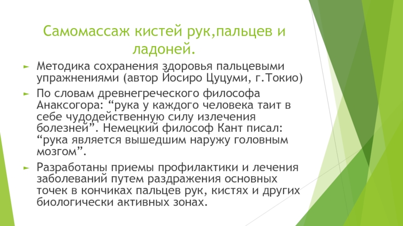 По словам древнегреческого философа Анаксогора: “рука у каждого человека таит в себе чудодейственную силу излечения болезней”. Немецкий философ Кант писал: “рука является вышедшим наружу головным мозгом”.