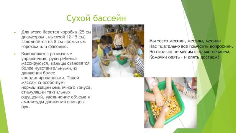 соответствующих всем органам и системам, расположенных на кистях рук и стопах. Воздействие на точки стоп осуществляется во время хождения по ребристым дорожкам и коврикам с пуговицами. На занятиях происходит стимулирование активных точек, расположенных на пальцах рук и стопах ребенка при помощи различных приспособлений ( шарики , массажные мячики, грецкие орехи, колючие валики).