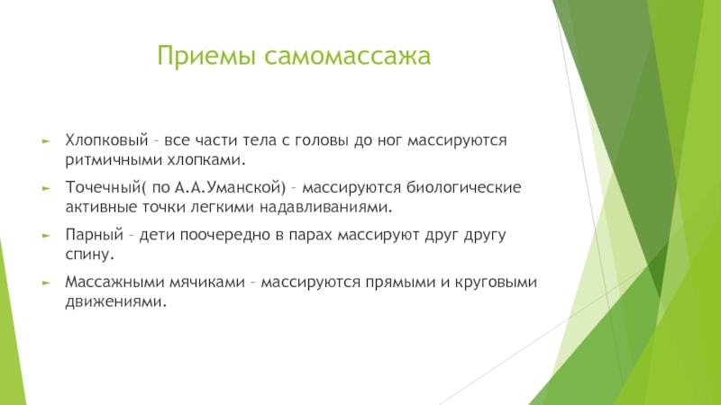 Точечный( по А.А.Уманской) – массируются биологические активные точки легкими надавливаниями.