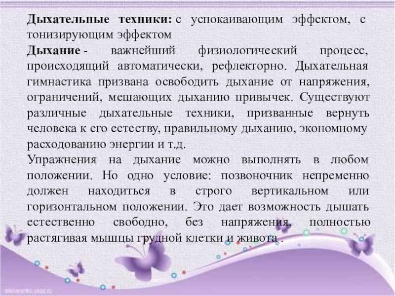 Слайд 3Дыхательные техники: с успокаивающим эффектом, с тонизирующим эффектом