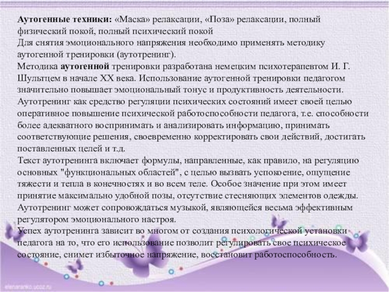 Методика аутогенной тренировки разработана немецким психотерапевтом И. Г. Шультцем в начале XX века. Использование аутогенной тренировки педагогом значительно повышает эмоциональный тонус и продуктивность деятельности. Аутотренинг как средство регуляции психических состояний имеет своей целью оперативное повышение психической работоспособности педагога, т.е. способности более адекватного воспринимать и анализировать информацию, принимать соответствующие решения, своевременно корректировать свои действий, достигать поставленных целей и т.д.