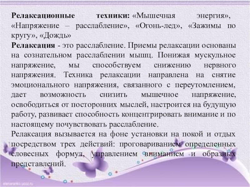 Релаксация - это расслабление. Приемы релаксации основаны на сознательном расслаблении мышц. Понижая мускульное напряжение, мы способствуем снижению нервного напряжения. Техника релаксации направлена на снятие эмоционального напряжения, связанного с переутомлением, дает возможность снизить мышечное напряжение, освободиться от посторонних мыслей, настроится на будущую работу, развивает способность концентрировать внимание и по настоящему почувствовать расслабление.