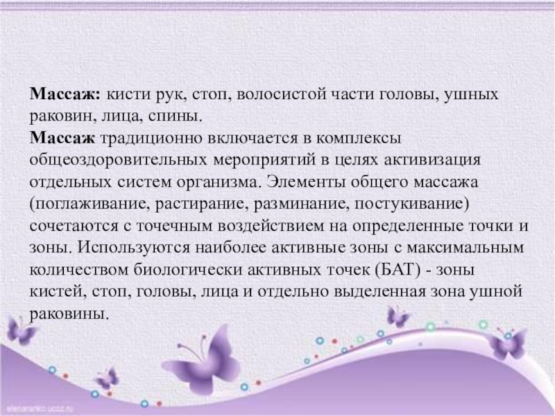 Слайд 7Массаж: кисти рук, стоп, волосистой части головы, ушных раковин, лица, спины.