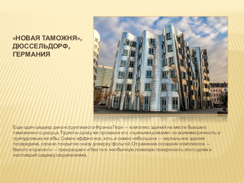 месте бывшего таможенного дворца. Туристы сразу же прозвали его «пьяными домами» за асимметричность и причудливые изгибы. Самое эффектное, хоть и самое небольшое — зеркальное здание посередине, словно покрытое снизу доверху фольгой. Отражения соседних комплексов — белого и красного — превращают и без того необычную ломаную поверхность этого дома в настоящий шедевр сюрреализма.
