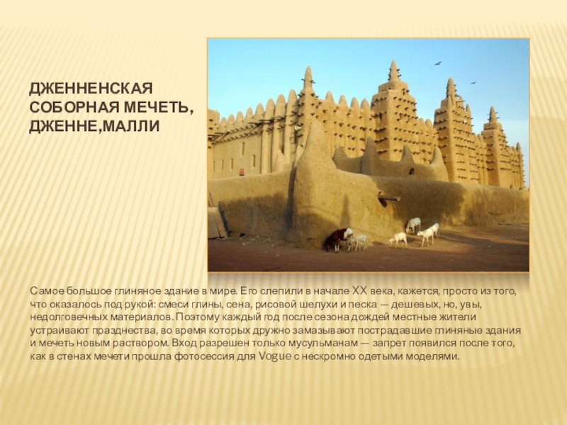 в начале XX века, кажется, просто из того, что оказалось под рукой: смеси глины, сена, рисовой шелухи и песка — дешевых, но, увы, недолговечных материалов. Поэтому каждый год после сезона дождей местные жители устраивают празднества, во время которых дружно замазывают пострадавшие глиняные здания и мечеть новым раствором. Вход разрешен только мусульманам — запрет появился после того, как в стенах мечети прошла фотосессия для Vogue с нескромно одетыми моделями.