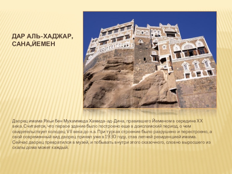 середине XX века. Считается, что первое здание было построено еще в доисламский период, о чем свидетельствует колодец VII века до н.э. При турках строение было разрушено и перестроено, а свой современный вид дворец принял уже в 1930 году, став летней резиденцией имама. Сейчас дворец превратился в музей, и побывать внутри этого сказочного, словно выросшего из скалы дома может каждый.
