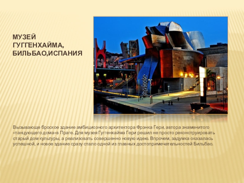 «танцующего дома»в Праге. Для музея Гуггенхайма Гери решил не просто реконструировать старый дом культуры, а реализовать совершенно новую идею. Впрочем, задумка оказалась успешной, и новое здание сразу стало одной из главных достопримечательностей Бильбао.