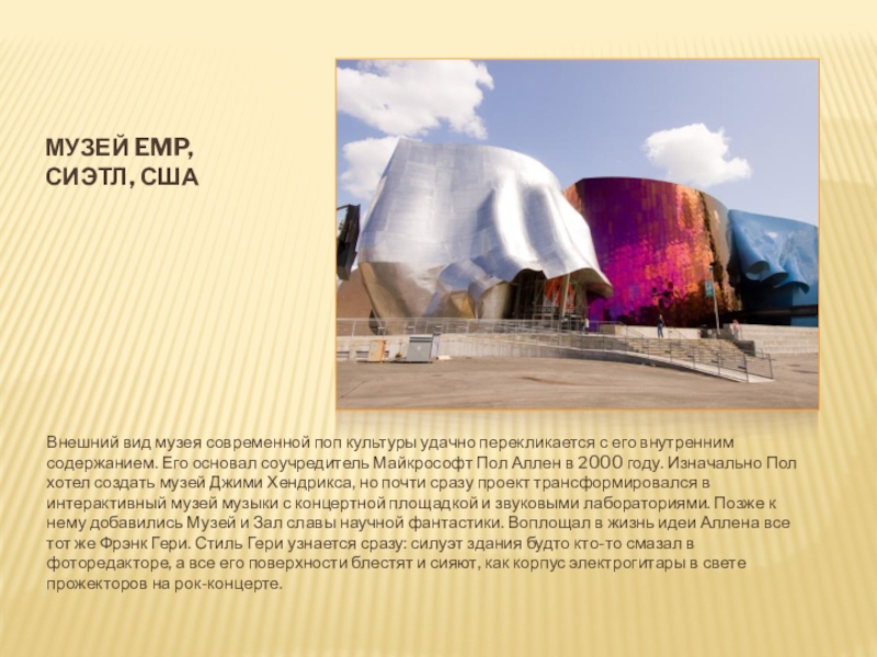 с его внутренним содержанием. Его основал соучредитель Майкрософт Пол Аллен в 2000 году. Изначально Пол хотел создать музей Джими Хендрикса, но почти сразу проект трансформировался в интерактивный музей музыки с концертной площадкой и звуковыми лабораториями. Позже к нему добавились Музей и Зал славы научной фантастики. Воплощал в жизнь идеи Аллена все тот же Фрэнк Гери. Стиль Гери узнается сразу: силуэт здания будто кто-то смазал в фоторедакторе, а все его поверхности блестят и сияют, как корпус электрогитары в свете прожекторов на рок-концерте.