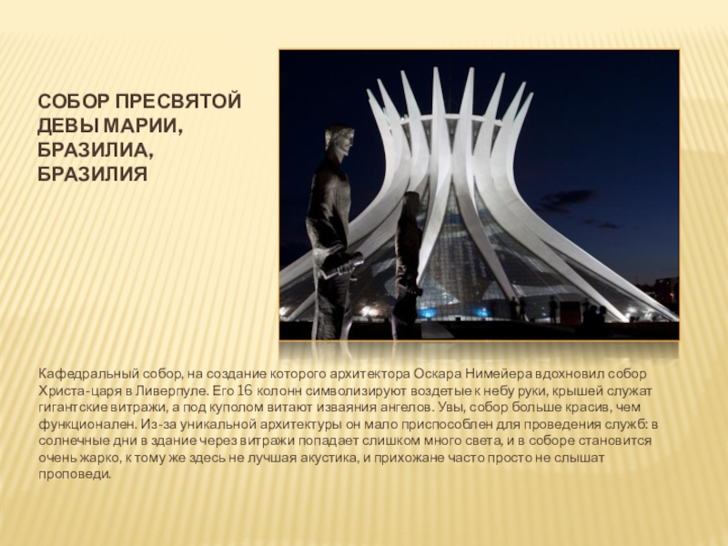 Оскара Нимейера вдохновил собор Христа-царя в Ливерпуле. Его 16 колонн символизируют воздетые к небу руки, крышей служат гигантские витражи, а под куполом витают изваяния ангелов. Увы, собор больше красив, чем функционален. Из-за уникальной архитектуры он мало приспособлен для проведения служб: в солнечные дни в здание через витражи попадает слишком много света, и в соборе становится очень жарко, к тому же здесь не лучшая акустика, и прихожане часто просто не слышат проповеди.