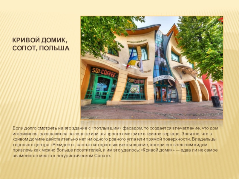 фасадом, то создается впечатление, что дом искривился, расплавился на солнце или вы просто смотрите в кривое зеркало. Занятно, что в кривом домике действительно нет ни одного ровного угла или прямой поверхности. Владельцы торгового центра «Резидент», частью которого является здание, хотели его внешним видом привлечь как можно больше посетителей, и им это удалось: «Кривой домик» — едва ли не самое знаменитое место в нетуристическом Сопоте.