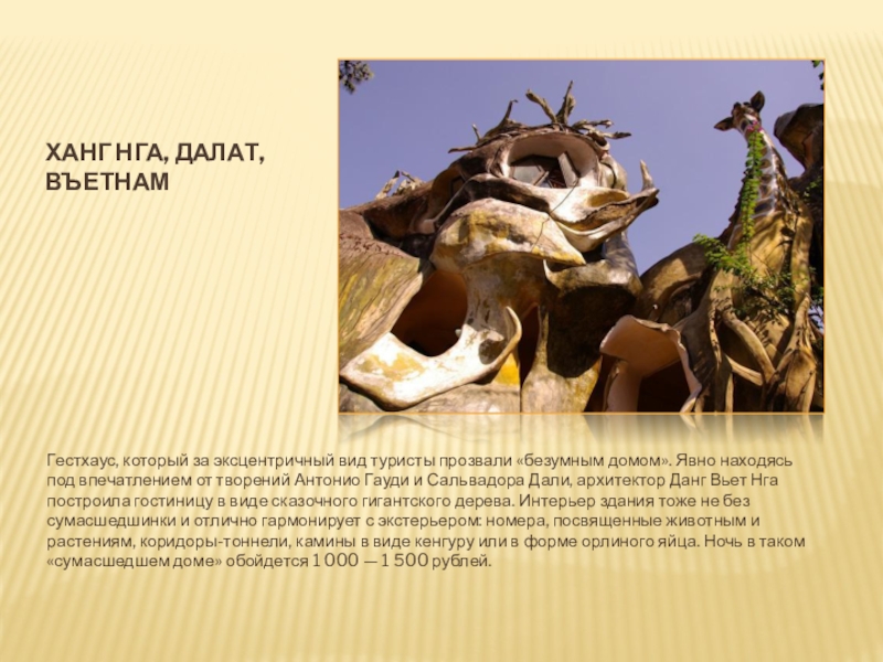 Явно находясь под впечатлением от творений Антонио Гауди и Сальвадора Дали, архитектор Данг Вьет Нга построила гостиницу в виде сказочного гигантского дерева. Интерьер здания тоже не без сумасшедшинки и отлично гармонирует с экстерьером: номера, посвященные животным и растениям, коридоры-тоннели, камины в виде кенгуру или в форме орлиного яйца. Ночь в таком «сумасшедшем доме» обойдется 1 000 — 1 500 рублей.