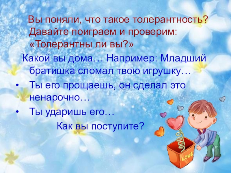 Слайд 10 Вы поняли, что такое толерантность? Давайте поиграем и