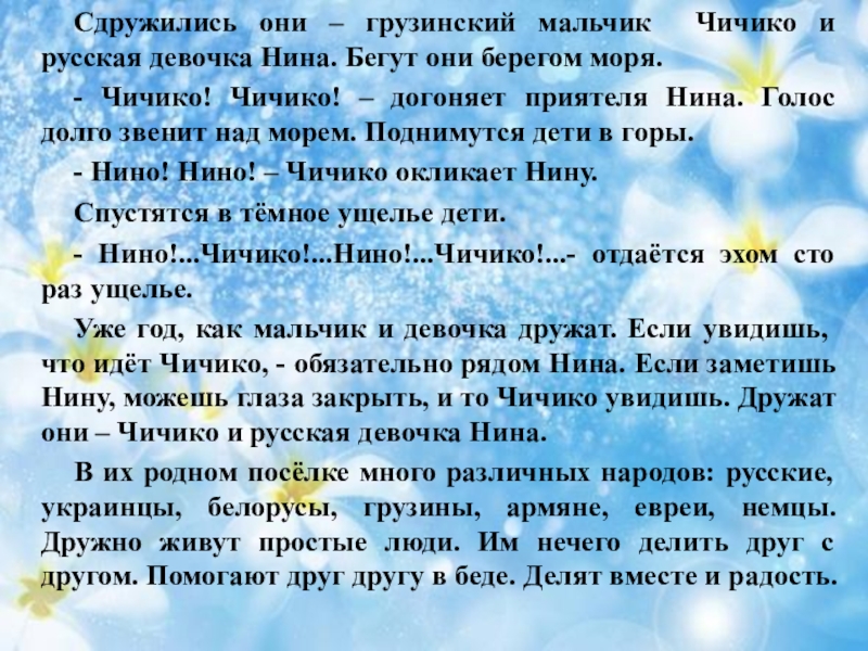 Слайд 3Сдружились они – грузинский мальчик Чичико и русская девочка Нина. Бегут