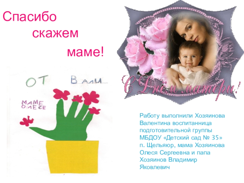 Работу выполнили Хозяинова Валентина воспитанница подготовительной группы МБДОУ «Детский сад № 35» п. Щельяюр, мама Хозяинова Олеся Сергеевна и папа Хозяинов Владимир Яковлевич