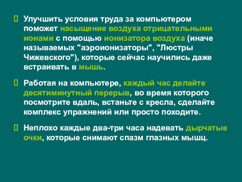 Слайд 23Улучшить условия труда за компьютером поможет насыщение воздуха отрицательными ионами с