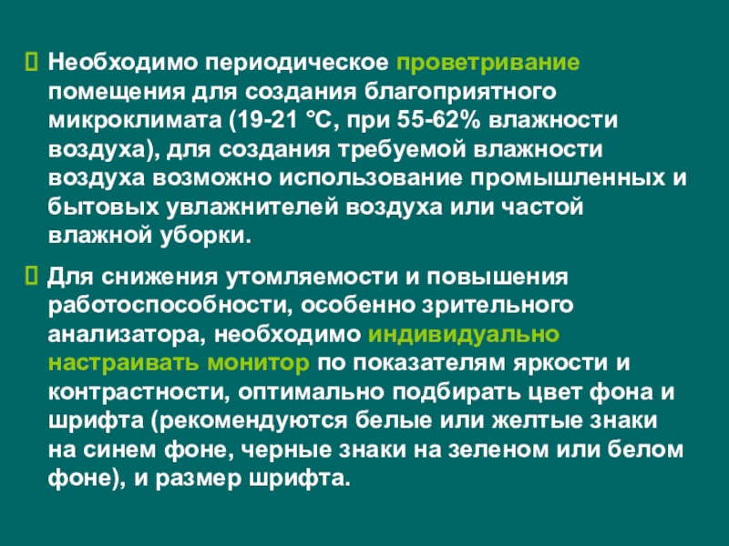 Для снижения утомляемости и повышения работоспособности, особенно зрительного анализатора, необходимо индивидуально настраивать монитор по показателям яркости и контрастности, оптимально подбирать цвет фона и шрифта (рекомендуются белые или желтые знаки на синем фоне, черные знаки на зеленом или белом фоне), и размер шрифта.