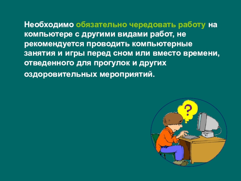 Слайд 17Необходимо обязательно чередовать работу на компьютере с другими видами работ, не