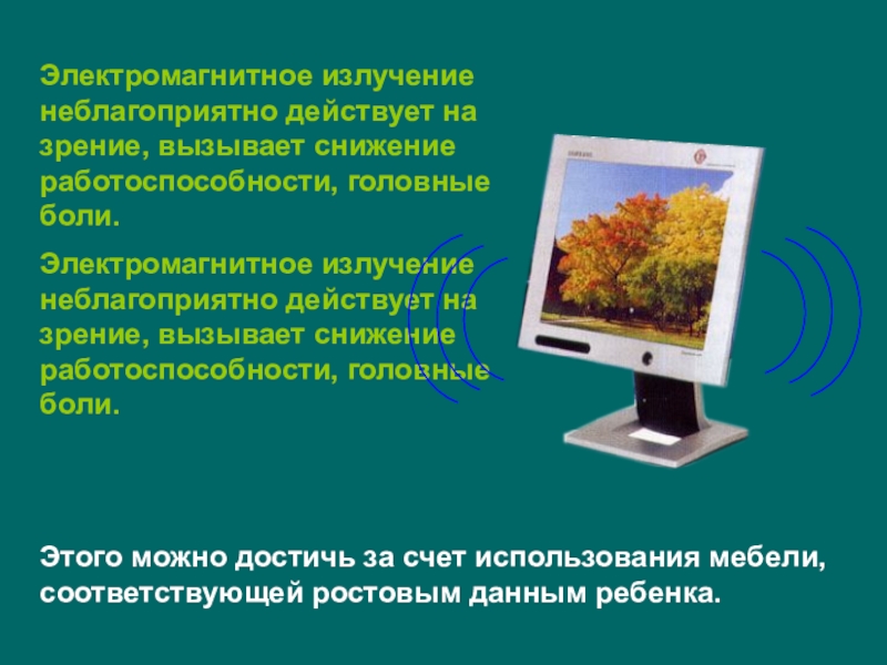 Слайд 10Электромагнитное излучение неблагоприятно действует на зрение, вызывает снижение работоспособности, головные боли.