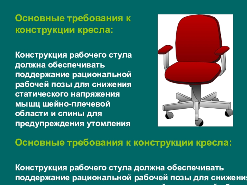 Конструкция рабочего стула должна обеспечивать поддержание рациональной рабочей позы для снижения статического напряжения мышц шейно-плечевой области и спины для предупреждения утомления
