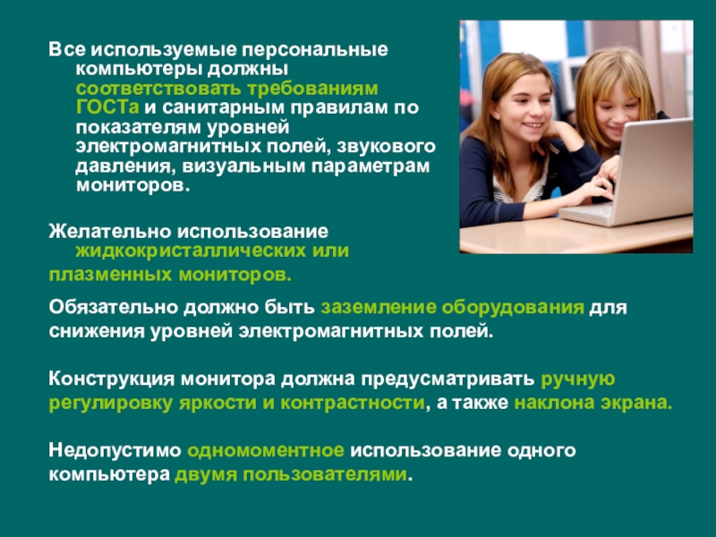 Слайд 5Все используемые персональные компьютеры должны соответствовать требованиям ГОСТа и санитарным правилам