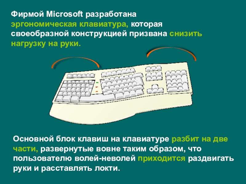 Фирмой Microsoft разработана эргономическая клавиатура, которая своеобразной конструкцией призвана снизить нагрузку на руки.