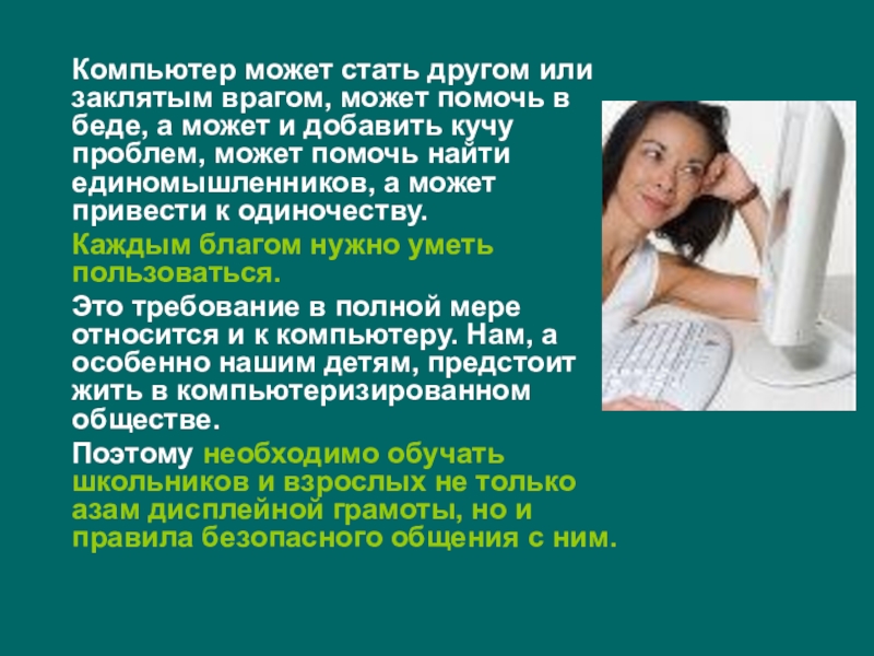 Слайд 24 Компьютер может стать другом или заклятым врагом, может помочь