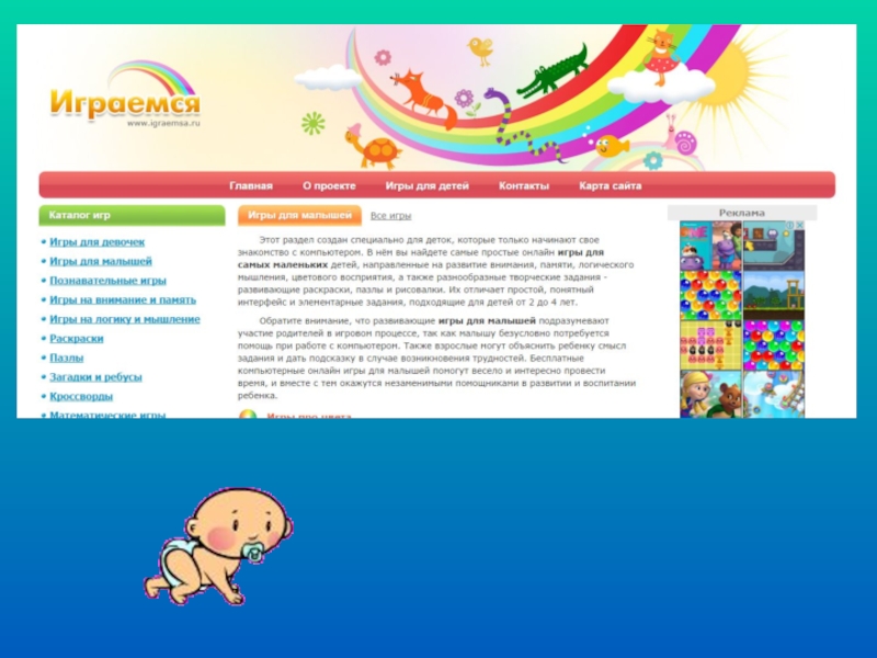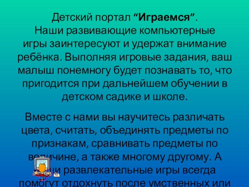 Слайд 3Детский портал “Играемся”. Наши развивающие компьютерные игры заинтересуют и удержат внимание ребёнка. Выполняя