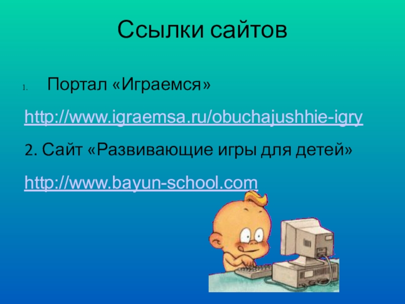 Ссылки сайтовПортал «Играемся» http://www.igraemsa.ru/obuchajushhie-igry2. Сайт «Развивающие игры для детей»http://www.bayun-school.com