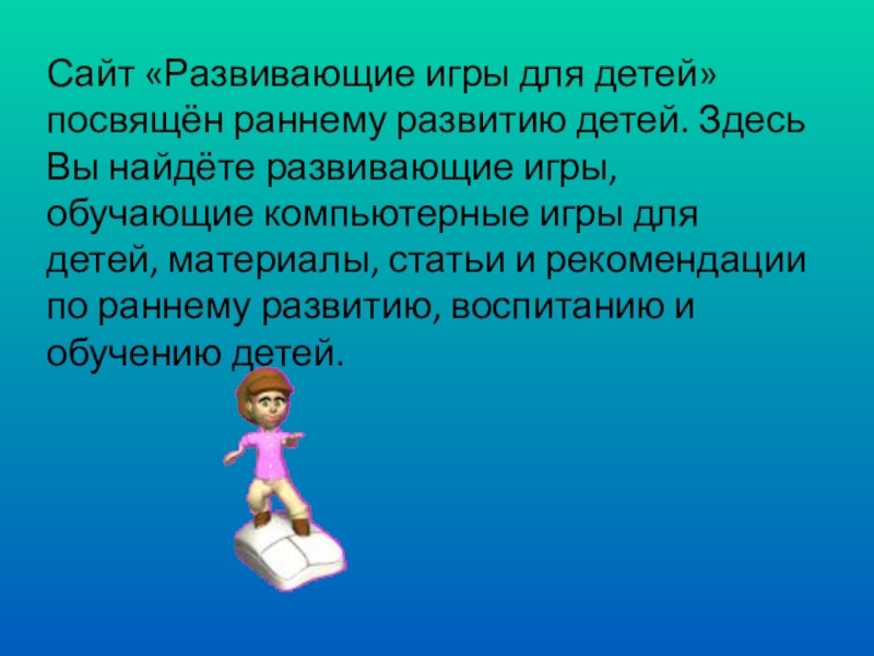 Слайд 5Сайт «Развивающие игры для детей» посвящён раннему развитию детей. Здесь Вы найдёте
