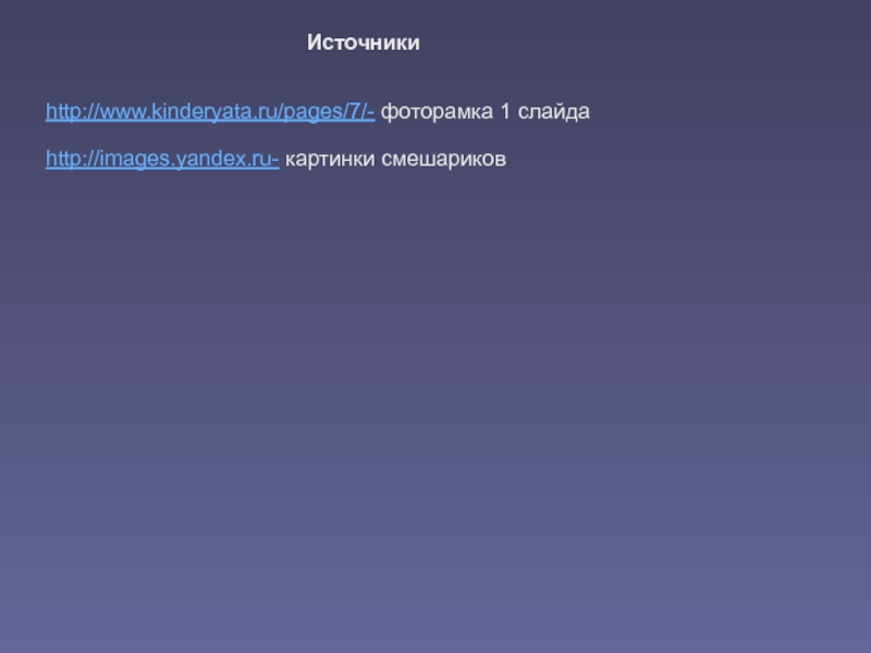 http://www.kinderyata.ru/pages/7/- фоторамка 1 слайдаИсточникиhttp://images.yandex.ru- картинки смешариков